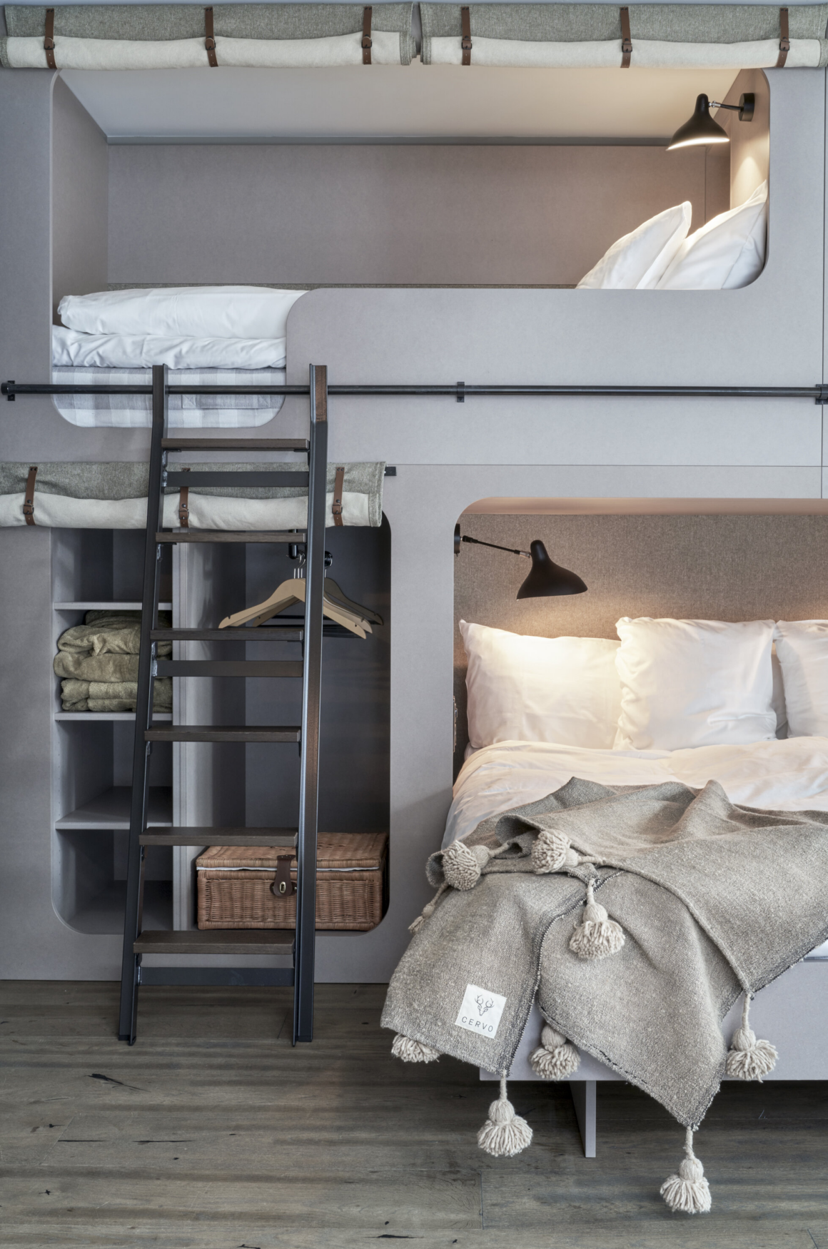 Among the three types of accommodations—The Huntsman, The Nomad, and The Alpinist—that now populate CERVO, warm colors, wooden surfaces, and natural materials coalesce with timelessly modern accents and views of the Matterhorn.
