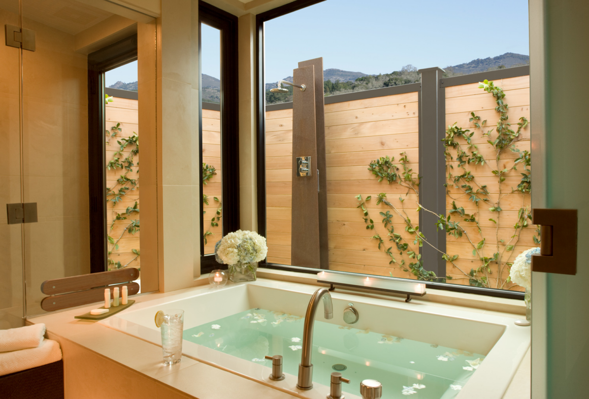 Groomed gardens and a genuine farmstead create an authentically “off the grid” feeling within Hotel Bardessono’s sixty-two rooms. Dubbed “personal havens,” some even feature bespoke private patios and enclosed courtyards.