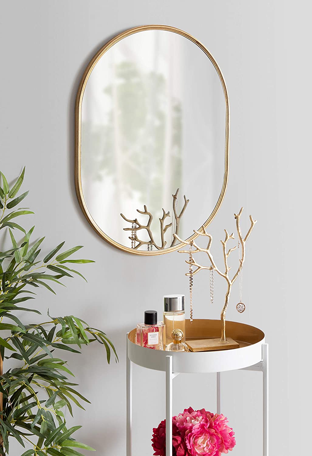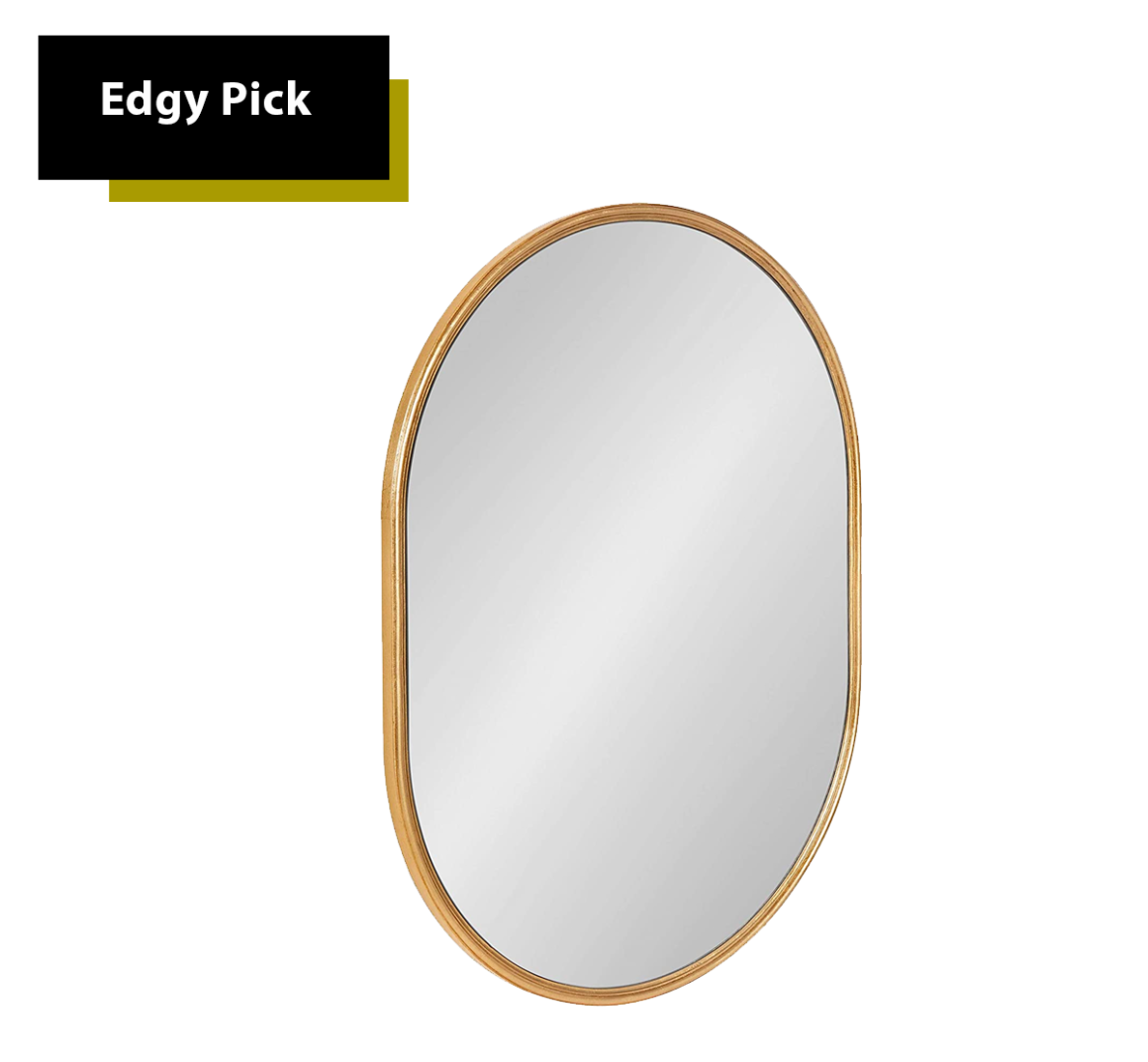 Black isn’t the only mirror color having a moment right now. Gold and brass tones continue to dominate as accent colors, as seen here in this marvelously mid-century inspired oval mirror.