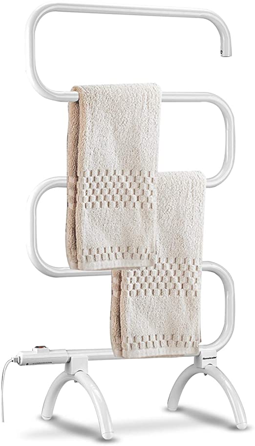Tangkula’s freestanding towel warmer stands out with a modern design in white. It is easy to assemble and also has the option to be wall-mounted in the bathroom. The medium sized warmer is a great option for smaller bathrooms, especially when it’s wall-mounted. The warmer is designed to be run throughout the day, and can dry towels and warm them up. This means that your family will always have warm dry towels ready when they need them!