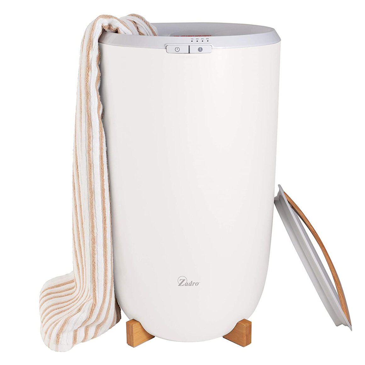 Want more than warm towels? This large bucket warmer by Zadro can hold multiple large towels, and can even be used to warm up your bedding or PJs. The warmer is designed as a large bucket in gray/ white sitting on top of a wooden stand. The clean design makes it an attractive addition in a bathroom or bedroom of any style.