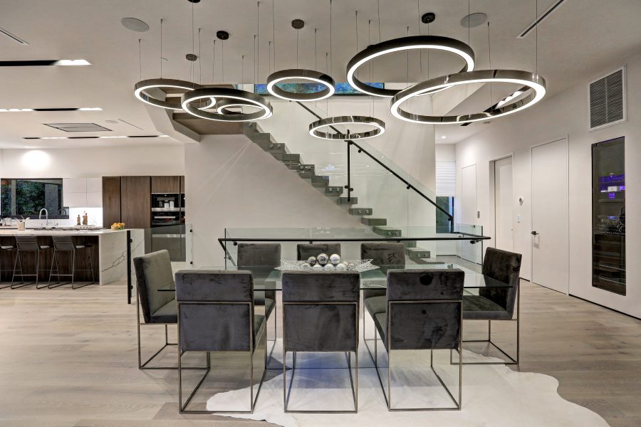 The house was designed mainly for entertaining, so there is no doubt that one of LA Build Corp’s favorite spaces in the home is the kitchen. They incorporated double dishwashers since the large home permitted it and they did not want there to be the possibility of having dishes or unsightly objects sprawled across the countertops, as it would be extremely visible in the main area in this open concept home. The dining area sits underneath a phenomenal grouping of unique lighting, perfect to turn on for evening ambiance.