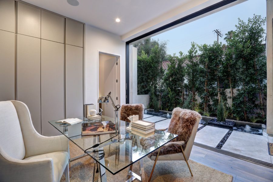 In order to really maximize the build, LA Build Corp incorporated a large basement with a common area for entertaining and then separate guest bedrooms, along with a spacious home theater. The first floor is an expansive open living space that houses the office, living area, dining area, and kitchen. The second floor houses the private rooms, which have balconies and exterior spaces that surround the home. These elements epitomize LA Build Corp’s main goal with this home: to create a home that has privacy while still allowing all rooms to have easy access to and from the middle and heart of the home.
