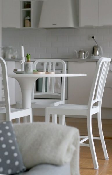 The Emeco Navy Chair is the quintessential kitchen chair. It has a simple, classic design that boasts universality. For this very reason, it is the perfect chair to go with the tulip table. The simplicity of both pieces creates a harmonious effect, yet the linear lines of the chair contrast nicely with the curves of the table.
