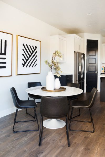 The wishbone chair is a popular choice to pair with the tulip table. While the tulip table is a sleek, streamlined, homogeneous structure, the wishbone chair looks more intricate and delicate and breaks up the solid construction of the tulip table. The tulip table also has a more modern aesthetic while the wishbone chair has a more traditional, farmhouse aesthetic. Together, this pairing creates a gentle contrast in both design and aesthetic. This duo is incredibly charming.